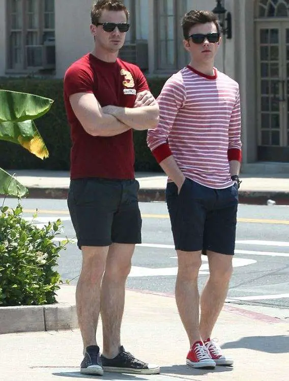 Too Cute: Chris and his boyfriend, Will coordinate their outfits sporting red tops and blue shorts, matching down to their accessories, in Converse trainers and black wayfarer sunglasses on the Fourth of July in 2013 (Photo: dailymail.co.uk)