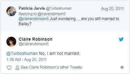 Claire, aged 40, is currently married to a guy named Bailey Robinson according to the sources. She has opted to keep her surname from her husband, Bailey Robinson's name. Claire has not revealed the exact date, the couple got married but one of her tweets reply suggests that she was not married until 2011.