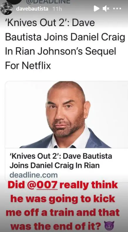 Dave Bautista Sharing News of Knives Out 2 On His Instagram Story: (Source: Dave Bautista's Instagram)