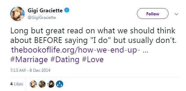 Opinion Towards Marriage: Gigi Graciette presenting her opinion towards marriage after reading the book, How-We-End-Up (Picture: Gigi's Twitter)