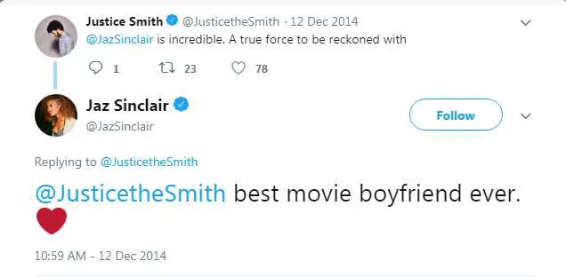 Apart from that Justice Smith on 12 December 2014, appreciated Jaz for her acting skills on a Twitter post to with she replied best movie boyfriend ever. This interaction between them made the doubts even more clear.