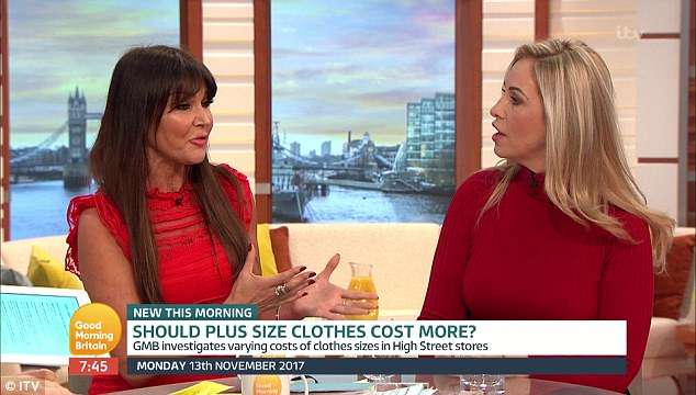 Social Justice Warrior:- Lizzie Cundy, 47 (left), argues that shoppers should pay more for their plus size clothes because they use more material. Josie Gibson, 32, called her comments 'ridiculous' in Good Morning Britain on 13 November 2017 (Photo:dailymail.com.uk)