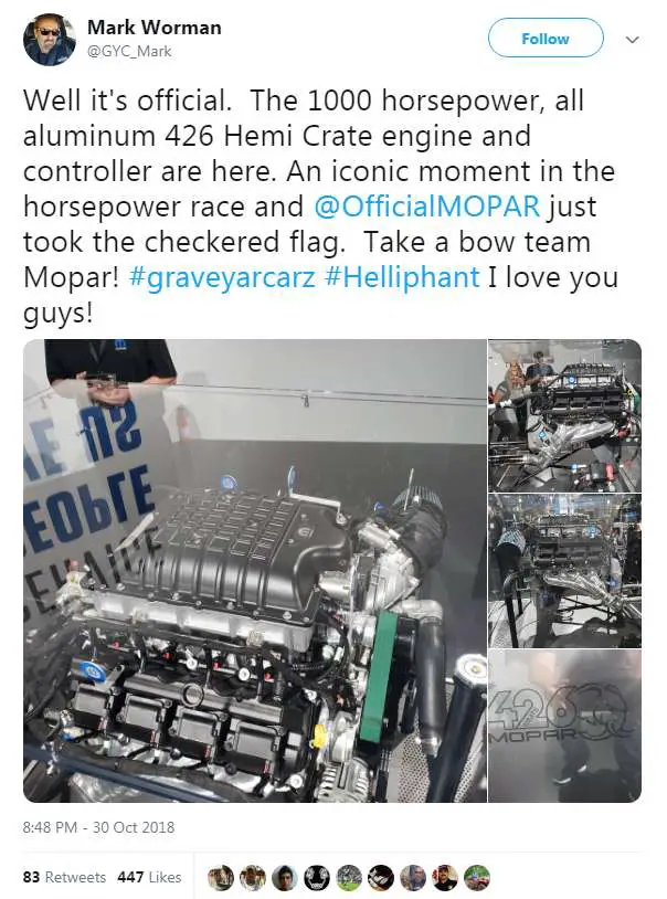 Mark Worman's Tweet: Mark Worman tweets about 1000 horsepower engine for his show 'Graveyard Carz' (Photo: Worman's Twitter)