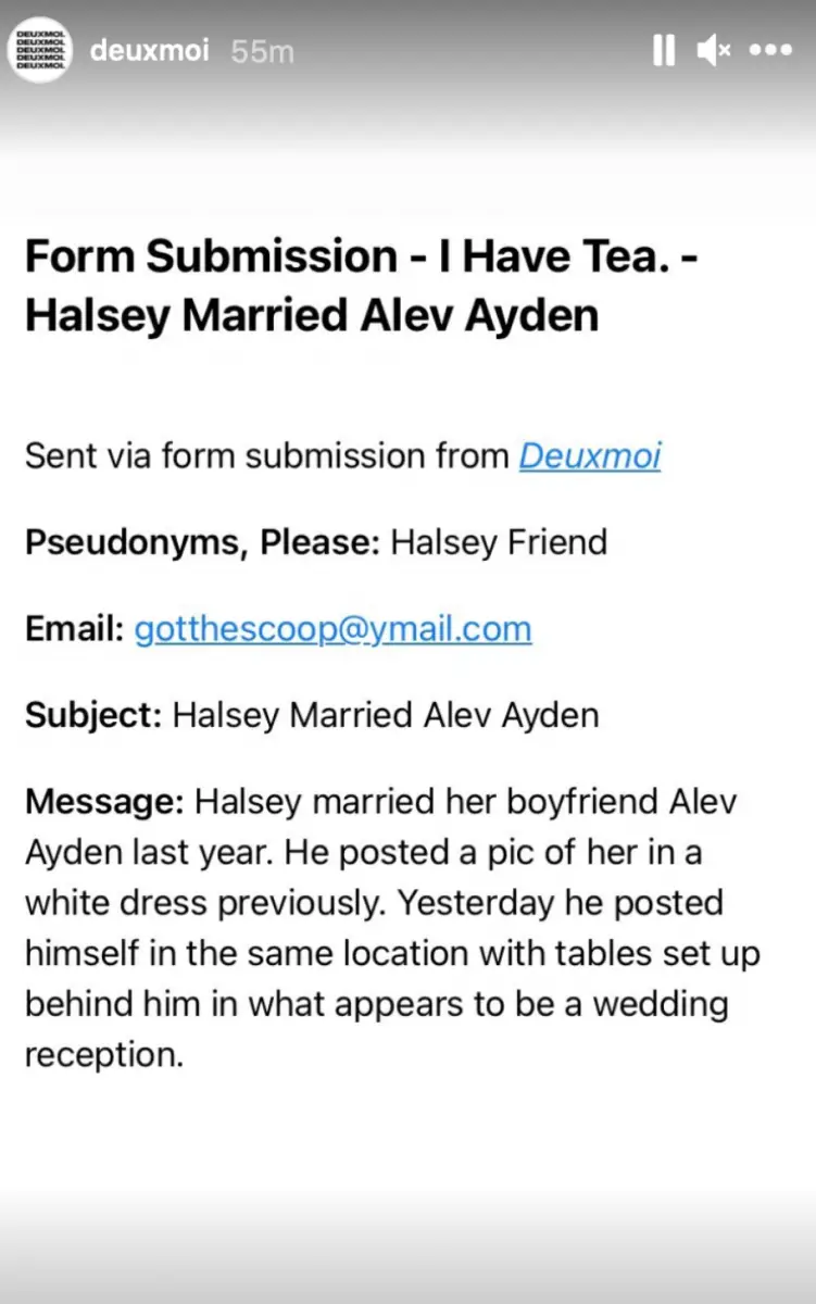 The 'Without Me' hitmaker has been making headlines after the celebrity gossip page DeuxMoi shared a submission from a fan who claimed Halsey got married to Aydin in 2020.