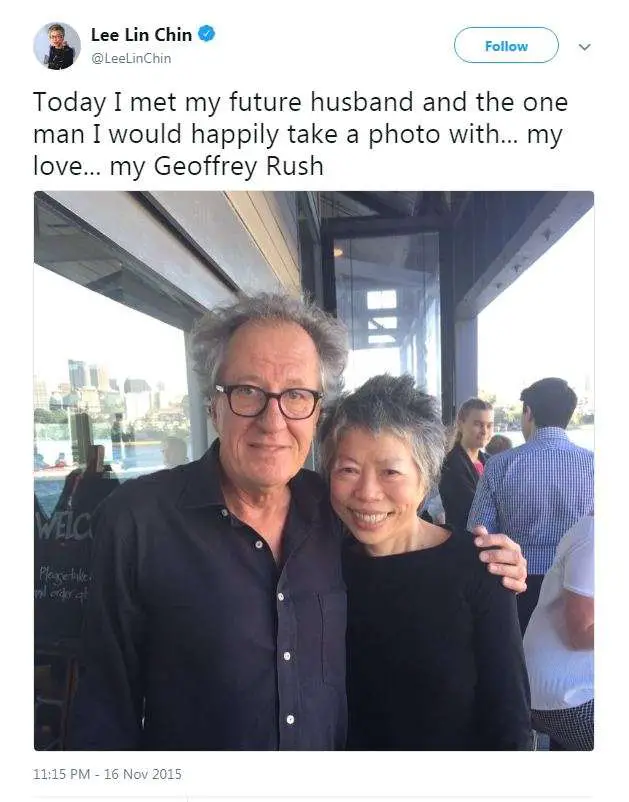 What She Needs In Partner: Lee Lin posts a picture with her so-called future husband, Geoffrey Rush on Twitter on 16 November 2015 (Photo: Lee Lin’s Twitter)