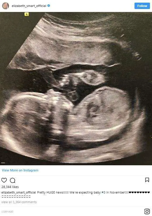 The victims’ rights advocate and kidnapping survivor announced she is expecting her third child via Instagram on 26 June 2018, with an ultrasound photo.