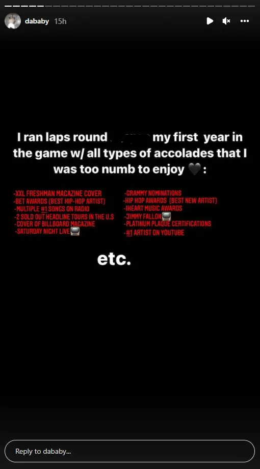 In the subsequent story, he reiterated his numbness. “2 & a half years in the game I done accomplished [expletive] that [n-word] ain’t did who been in this [expletive] 10 years+,” DaBaby said. “whole time I can’t feel NONE of it.”