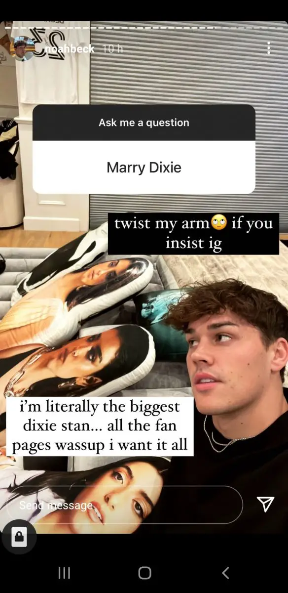 The fan had asked him to marry her while he replied, "twist my arm if you insist IG." The internet heartthrob had also uploaded a photo of him with D'Amelio cushions and noted that he was the biggest "Dixie stan."