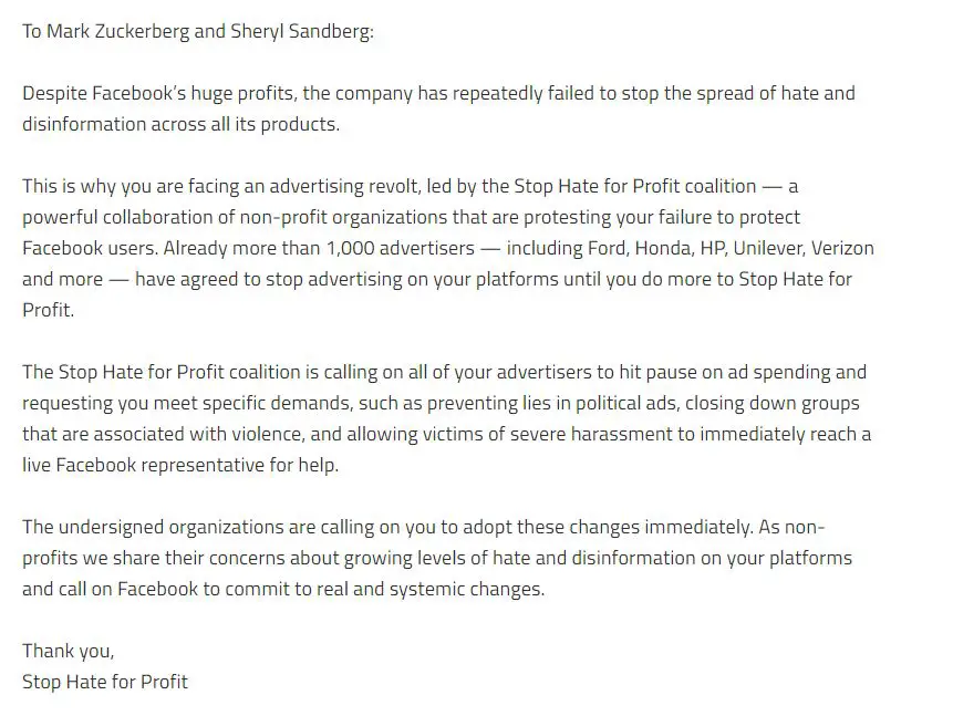 The letter is a continuation of the campaign's core "Hit For Pause" strategy that it has been adopting since early July against Facebook advertising policy. Since its inception, the campaign has been supported by over 1000 companies that are temporarily pausing ads on the social media platform.