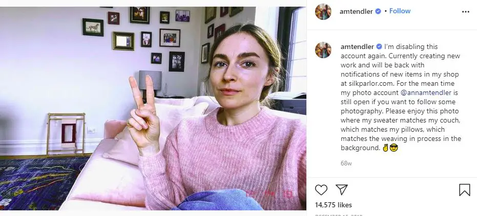 Tendler announced her Instagram hiatus in December 2019. Without revealing the reason for it, she simply posted a picture of herself with a peace hand gesture. The caption for it said that she was disabling the account to focus on her art for a while.