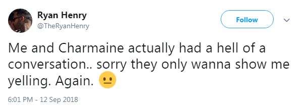 Fight: Ryan Henry tweeted about his fight with Black Ink's member, Charmaine -12 Sep 2018. (Photo: Ryan Henry's Twitter)