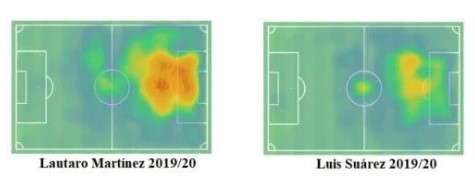 Comparison between heatmaps of Lautaro Martinez and Luis Suarez during the 2019-20 season (Photo: Total Football Analysis)